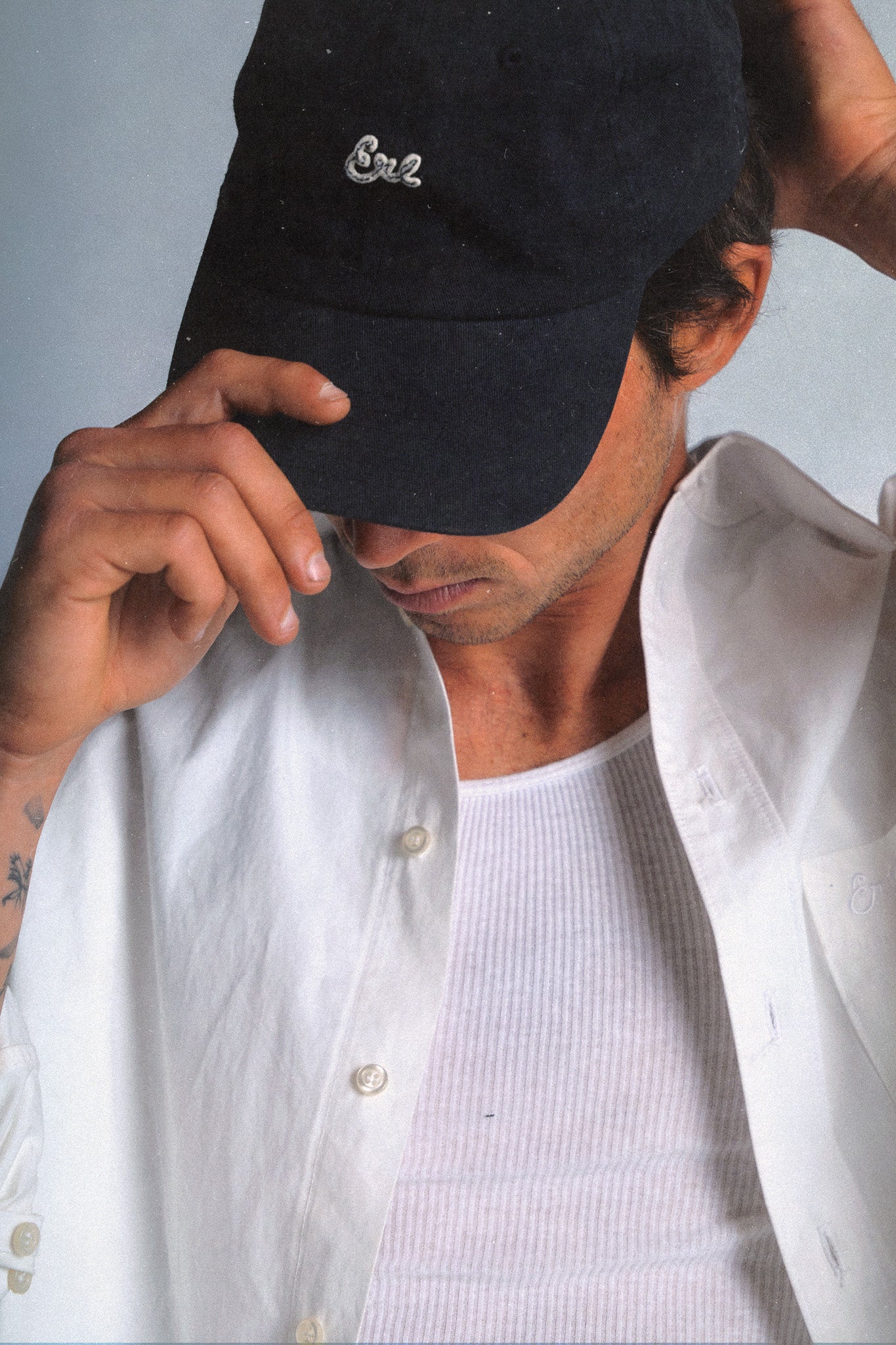 Baseball cap with ERL script applique in sun faded black. Hand aged for a vintage feel. Made in California.
