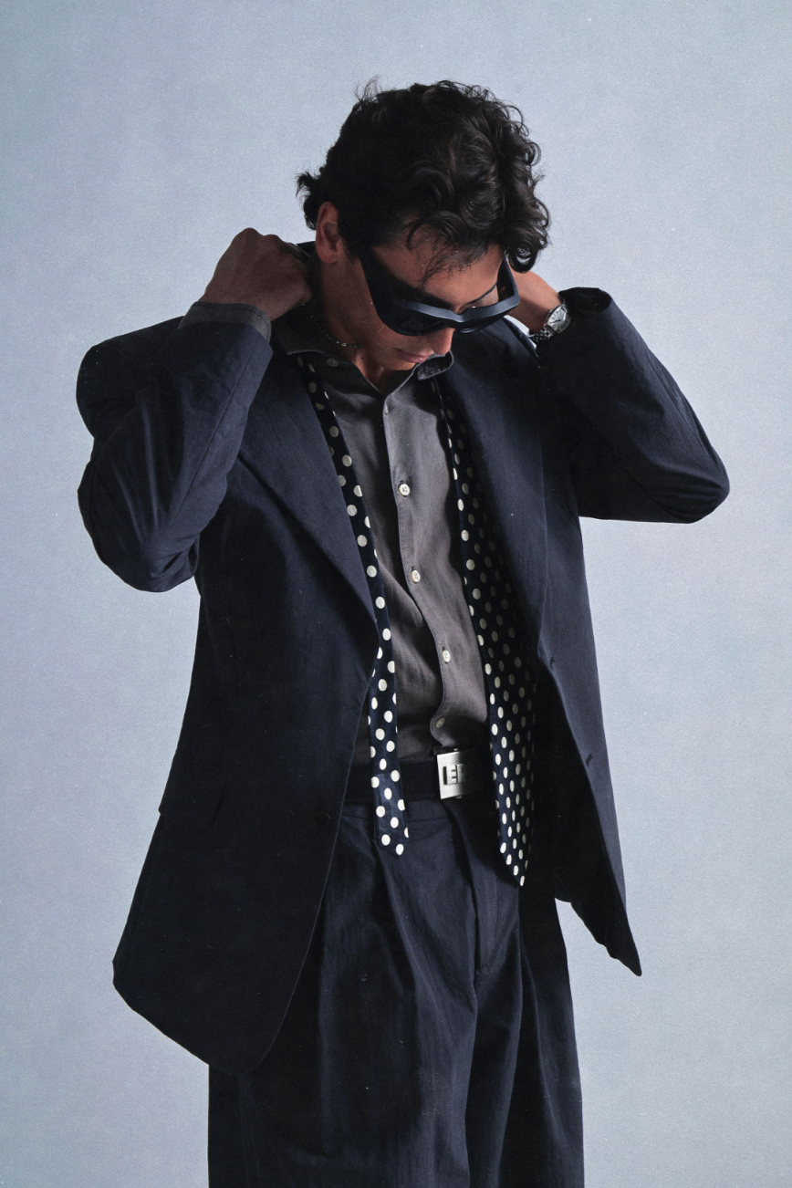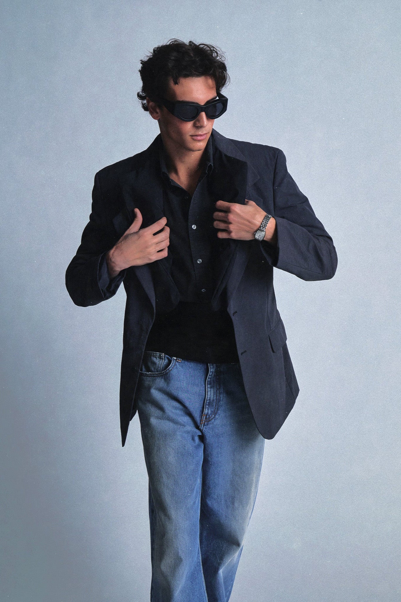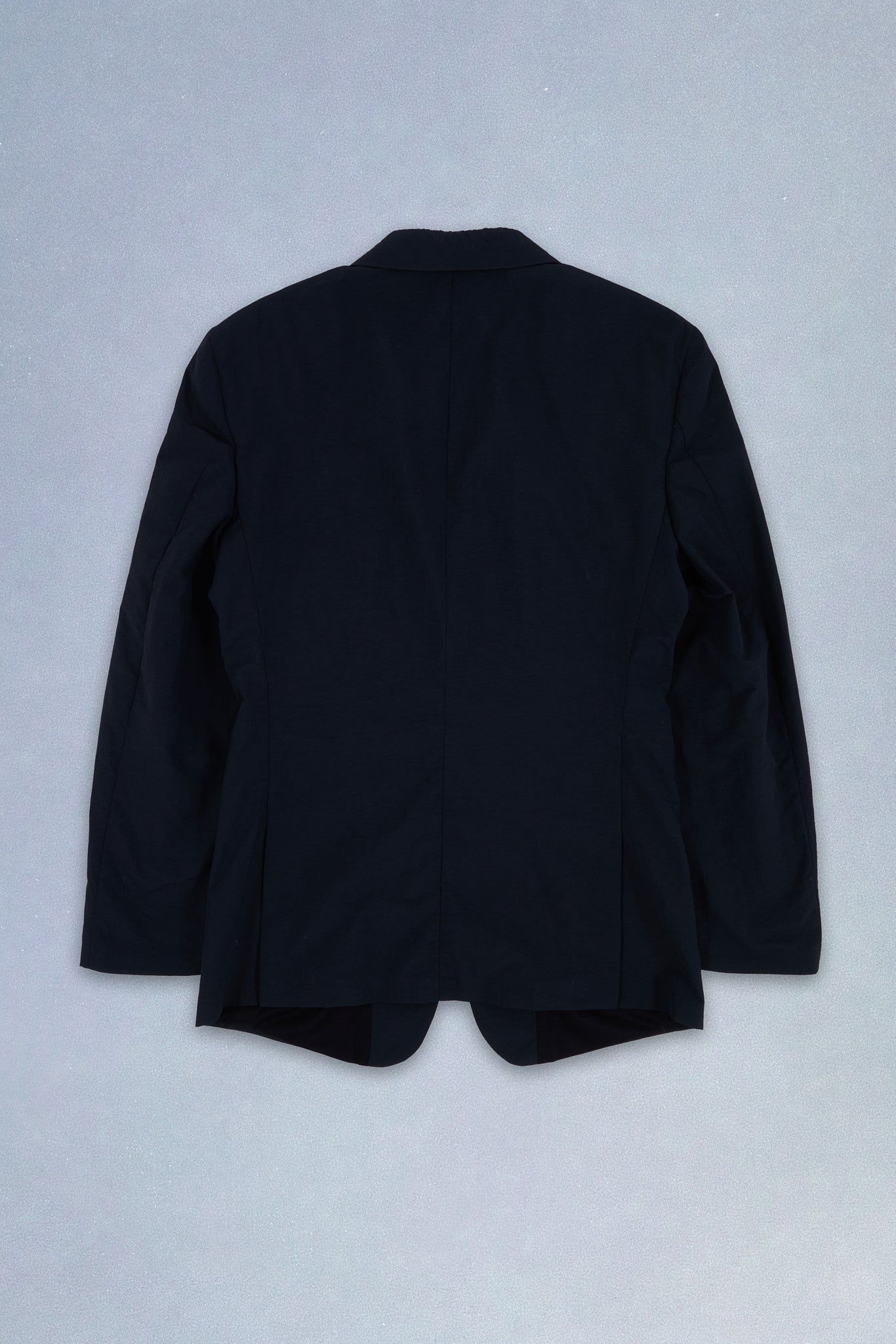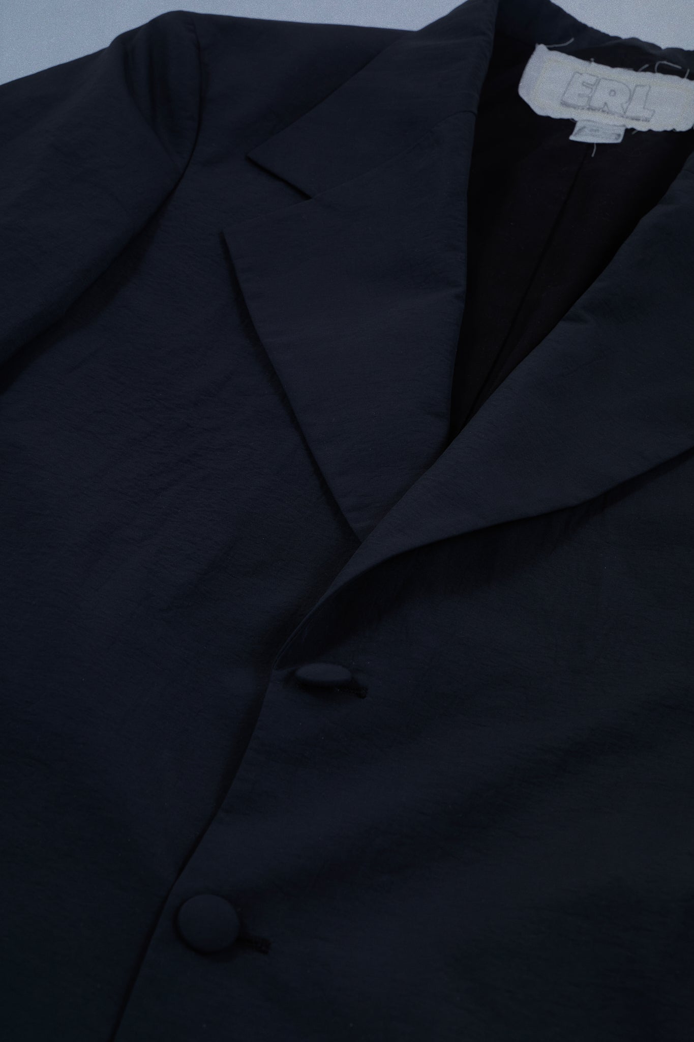 suit jacket in charcoal soft nylon. unique technical nylon fabric, engineered into a suit jacket. relaxed, easy fit. lined.