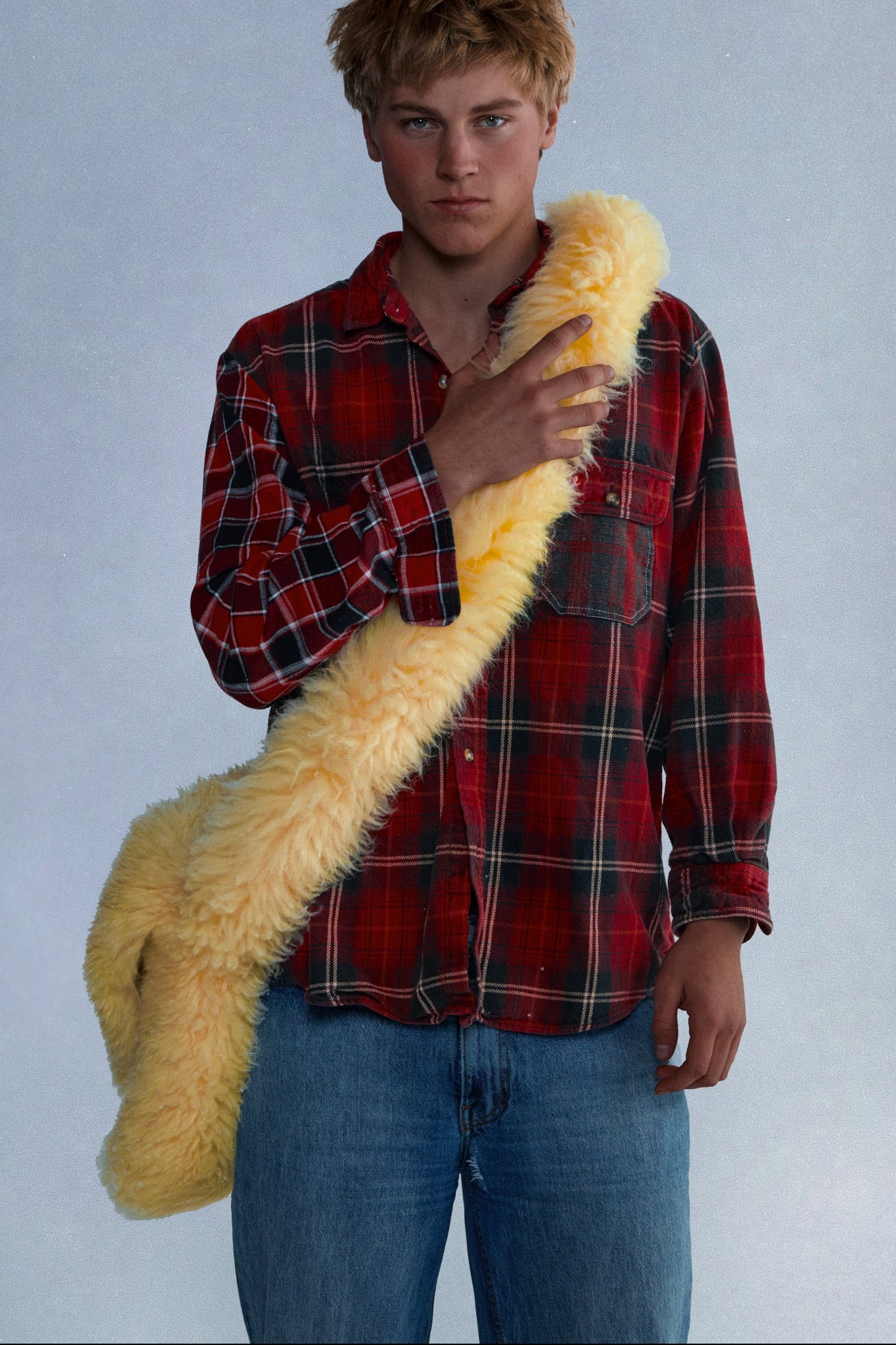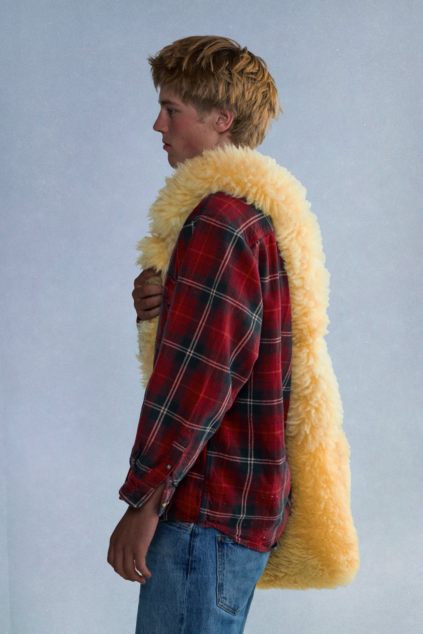 KAI IS 6' 1" wearing the shearling messenger bag.