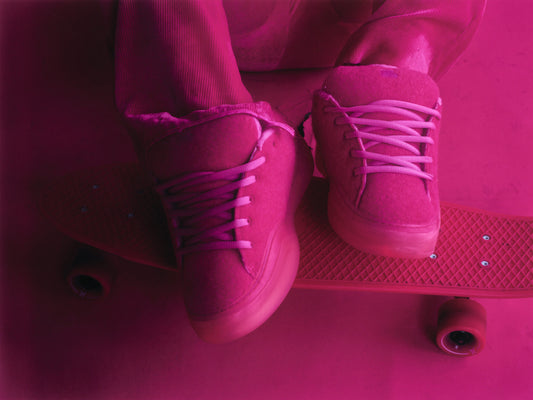 Limited edition bubblegum pink vamps featuring a unique wool felt upper with padded, plush felt lining for extreme comfort. A pink gum sole features a pink ERL logo. Finished with pink ERL shoelaces with silicone tips. Extra pair of cream white laces included. Designed in Venice Beach, California.