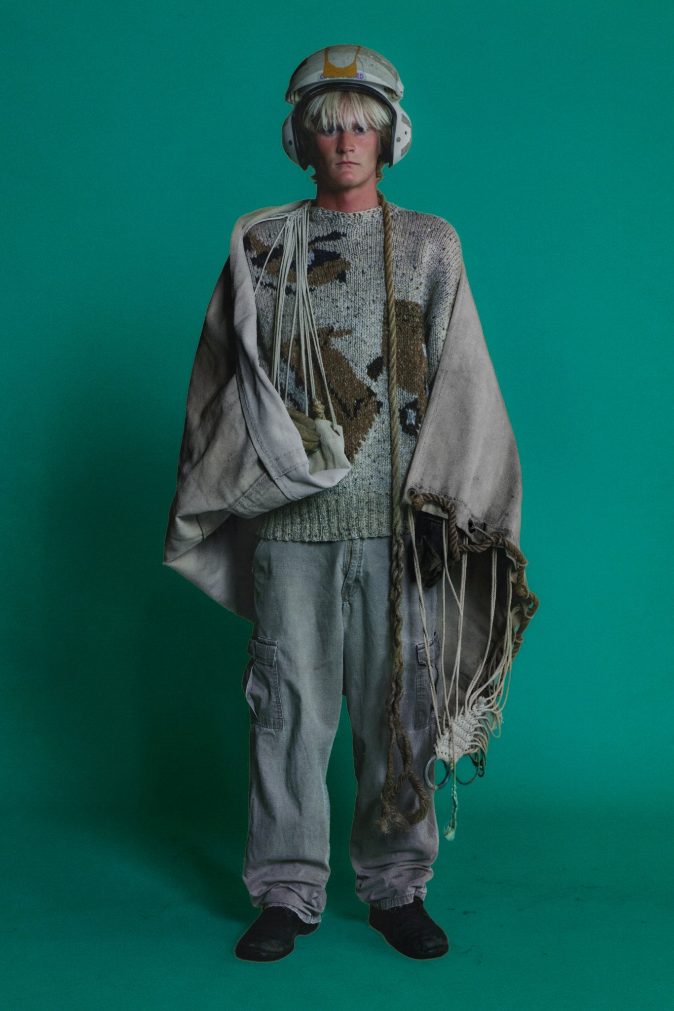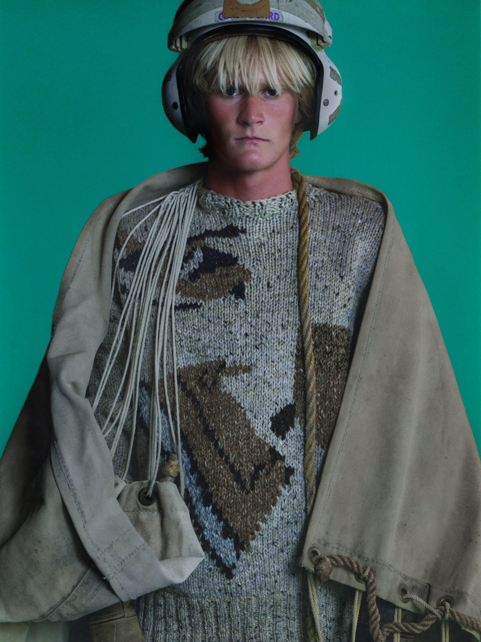 crafted from donegal homespun wool yarn, this hand knit crewneck sweater features an intarsia tank, helicopter, and jeep graphics with a relaxed fit. rolled neck collar. ribbed at wrists and waist. hand knit with two needles by olivia.