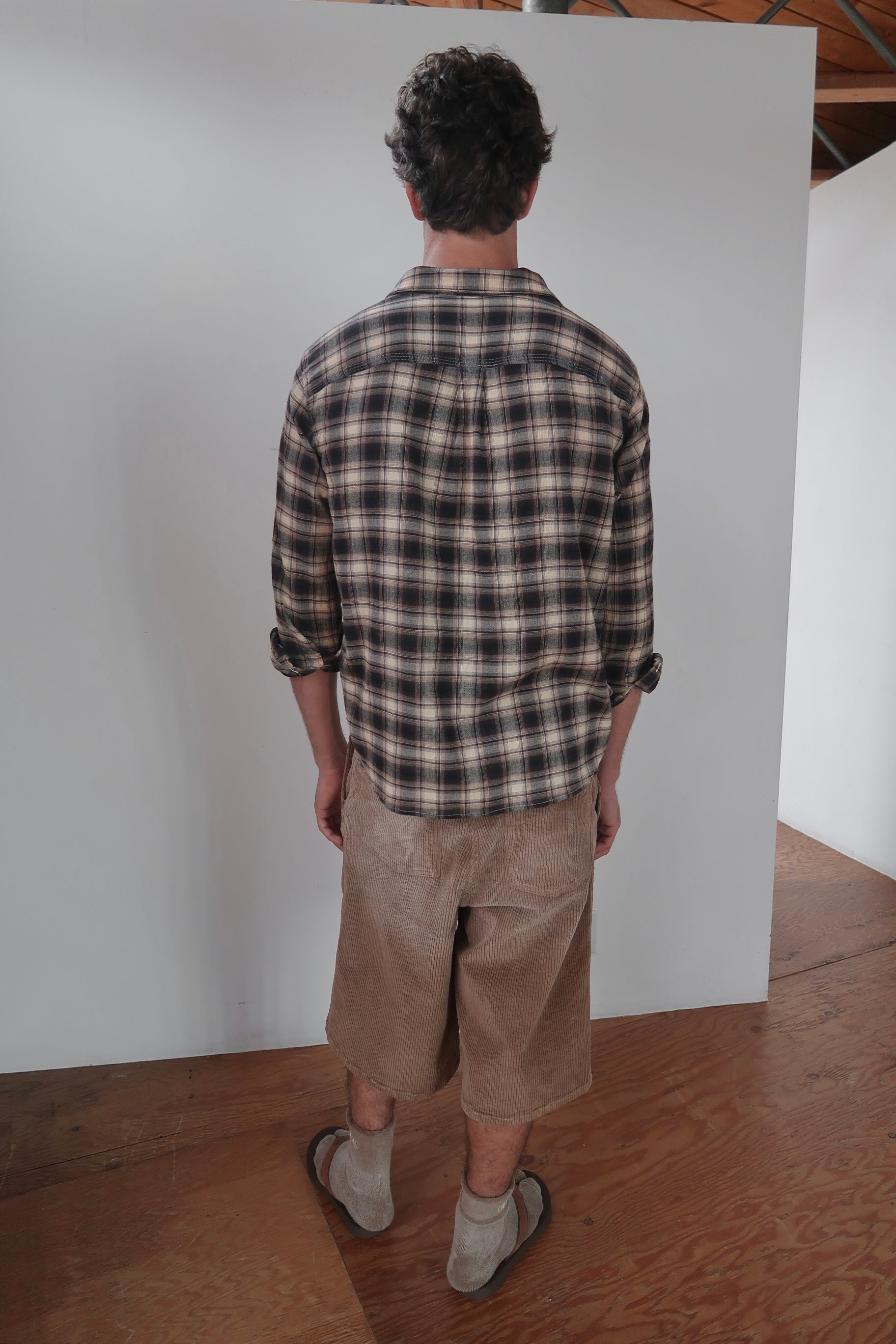 lightweight plaid shirt is made from overdyed deadstock fabric with washed vintage hand feel. triple topstitch details. erl signature embroidery on shirt pocket.
