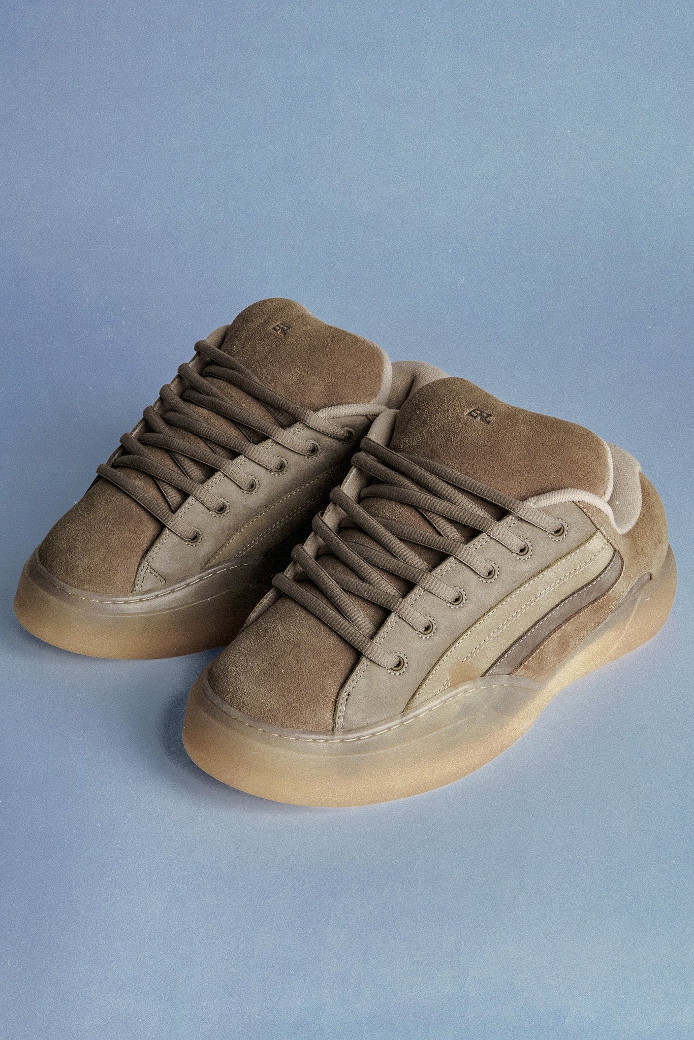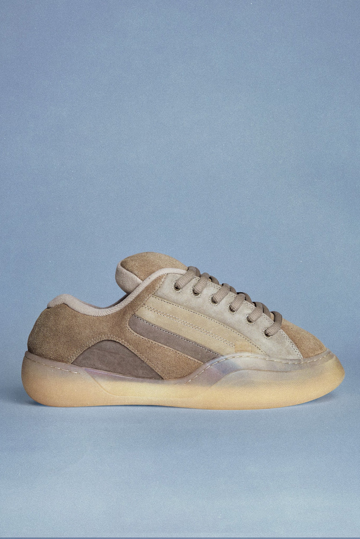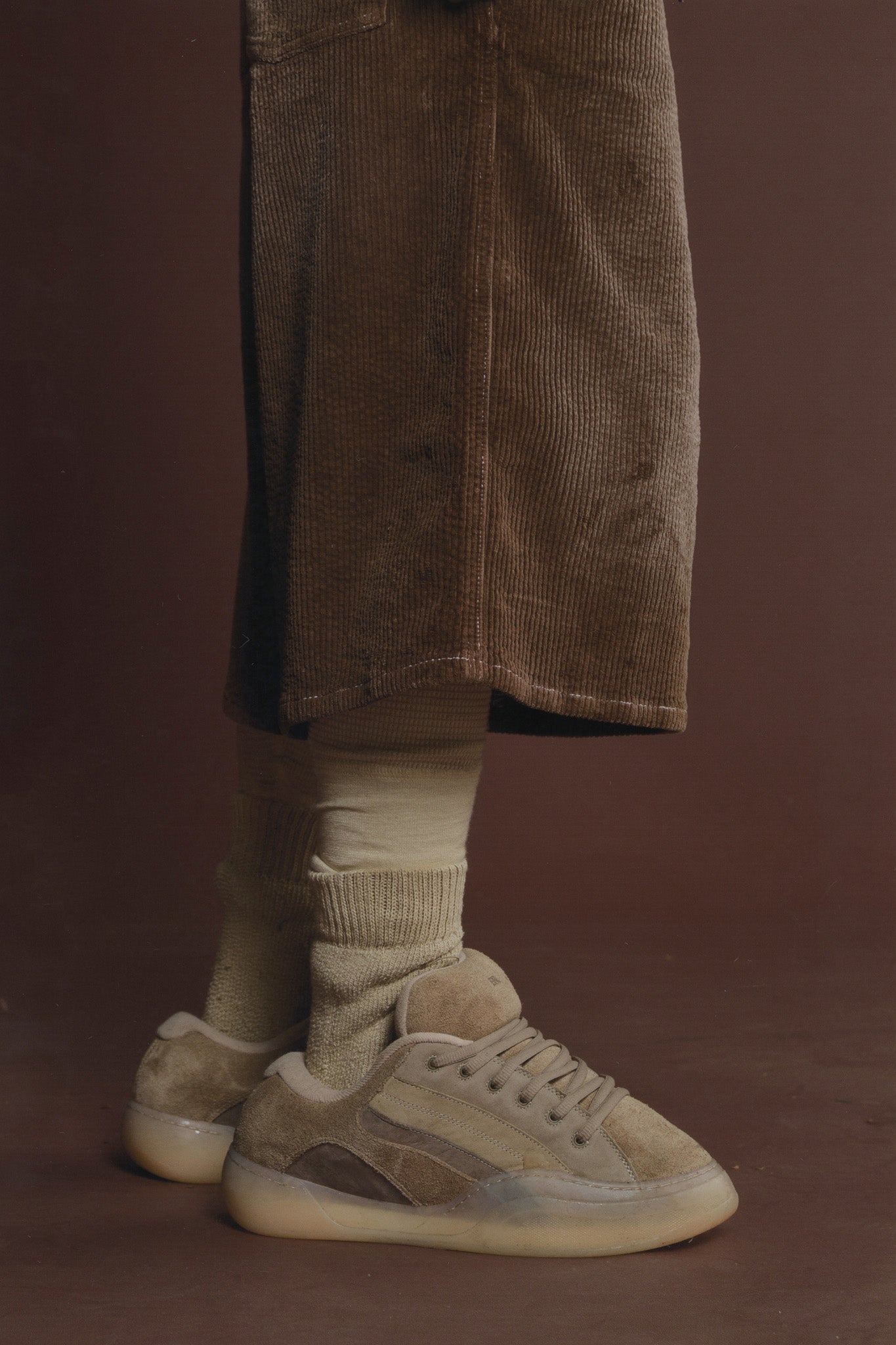 Washed in shades of cream California that recall the sun-drenched skate colors of venice beach. The upper is built from a four-color leather paneled construction anchored by rich cowhide suede — each panel cut, placed, and stitched with precision. Inside, a unique woven interior wraps the foot with subtle texture, while articulated foam is shaped for plush, all-day comfort. Custom 9 millimeter thick ERL laces with dipped aglets thread through the leather upper, paired with an ERL-stamped tongue and an ERL gum sole.