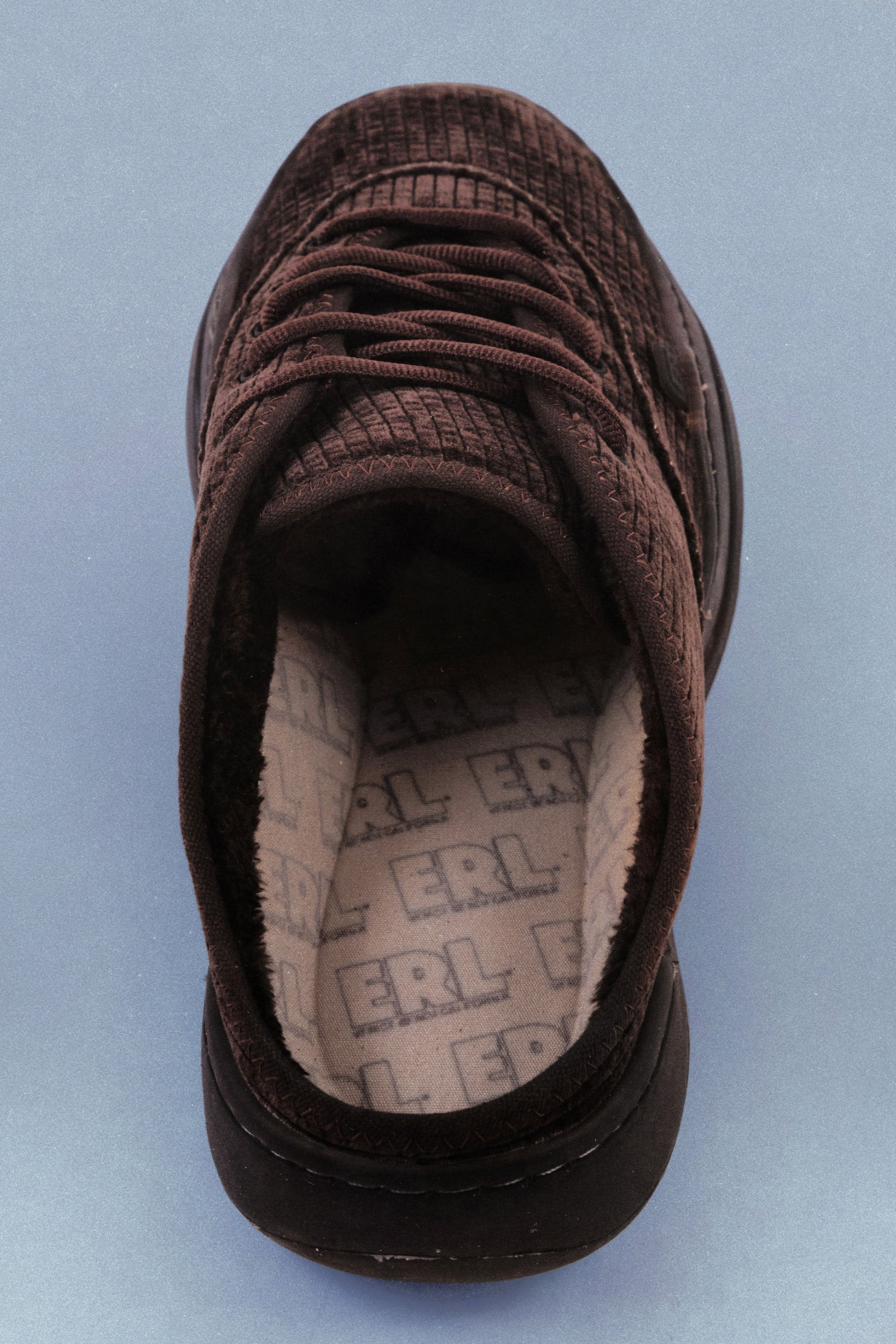 Aged corduroy mule in chocolate brown lined with plush faux shearling. zig zag stitching details. Transparent rubber outsole featuring California and ERL artwork. ERL artwork cushion sole. ERL rubber logo. Arrives in glossy cream hardside box with ERL tissue paper.